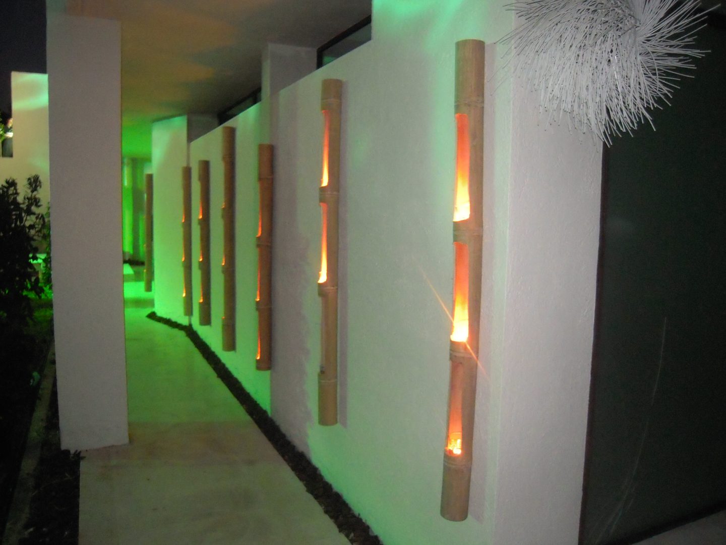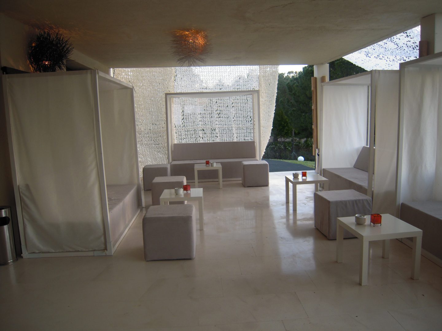 Se crearon diferentes zonas chill out, pensadas para el descanso y la socialización de los invitados. En algunas de estas áreas se optó por una iluminación más cálida y envolvente, utilizando lámparas de aceite y faroles, que ayudaron a generar un ambiente íntimo y acogedor, contrastando con la iluminación arquitectónica del resto del espacio.