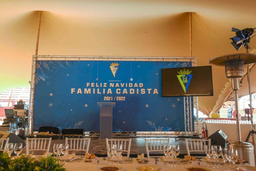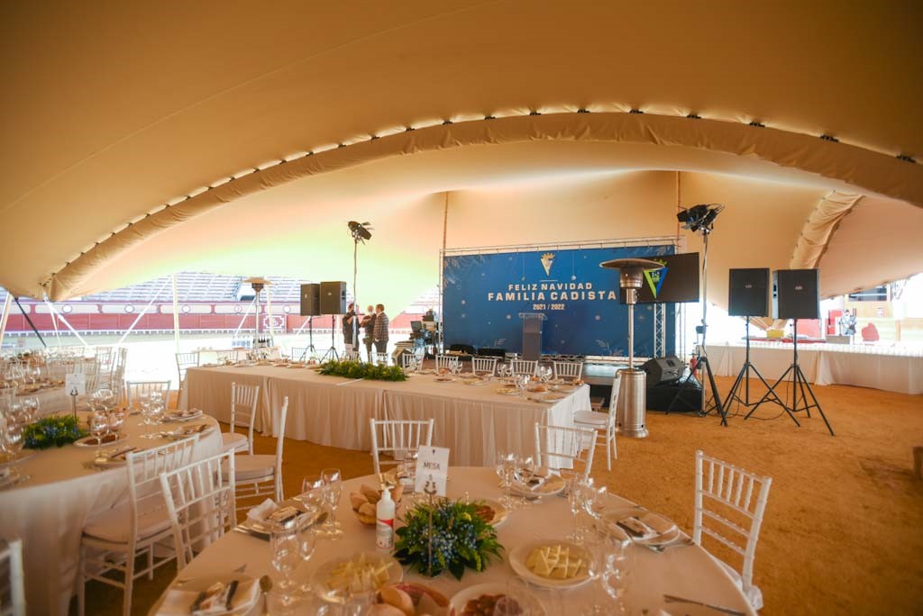 En la emblemática Plaza de Toros de Cádiz, realizamos un montaje espectacular de carpa para un evento corporativo y deportivo del Cádiz Club de Fútbol. La estructura, cuidadosamente diseñada, acogió a toda la familia cadista para celebrar la comida de Navidad, combinando comodidad, estilo y funcionalidad. La carpa y la iluminación crearon un ambiente festivo y acogedor, logrando que la celebración fuera inolvidable para jugadores, cuerpo técnico y algunos aficionados.