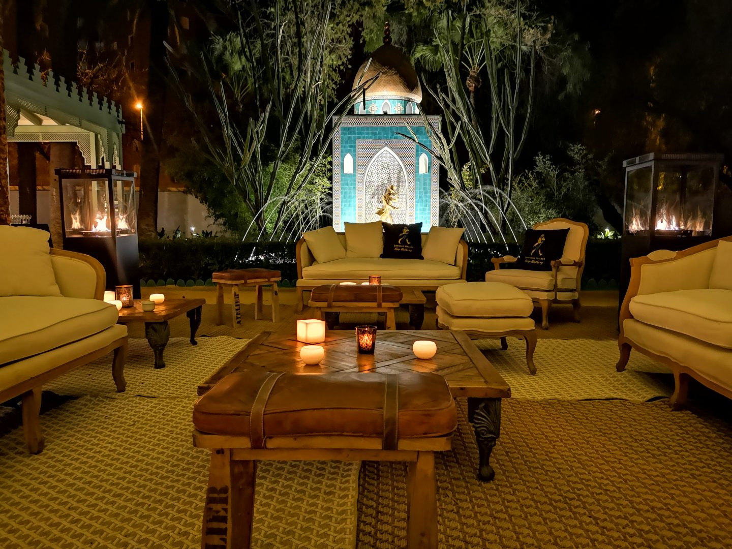 La zona VIP exterior se concibió con un estilo elegante y atemporal, utilizando nuestros conjuntos de chill out coloniales, que aportaron personalidad y distinción al espacio. La ambientación se completó con iluminación mediante velas y un techo de microled, creando una atmósfera cálida y envolvente, ideal para el encuentro y la conversación.